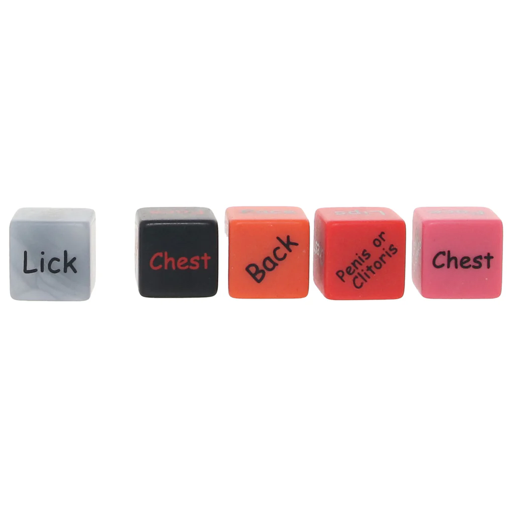 The silver die runs the show, calling out a teasing action like lick, tickle, or blow on. Everyone chooses a body-part die to represent themselves, then the roller picks which player gets involved. Roll the dice, choose the color, and let the combo decide the moment.
