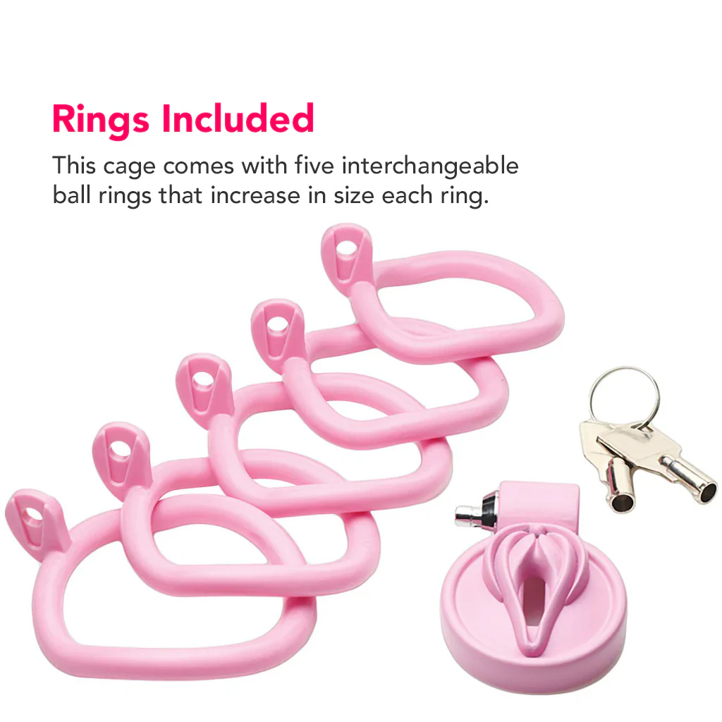 This pink mini Cage fully restrains their shaft and tip, leaving only a pee-friendly (and pussy-inspired!) opening un-confined. You'll lock it up tight to one of five included rings looped behind their balls before letting them say bye-bye (if you feel generous) to the cock you now own.